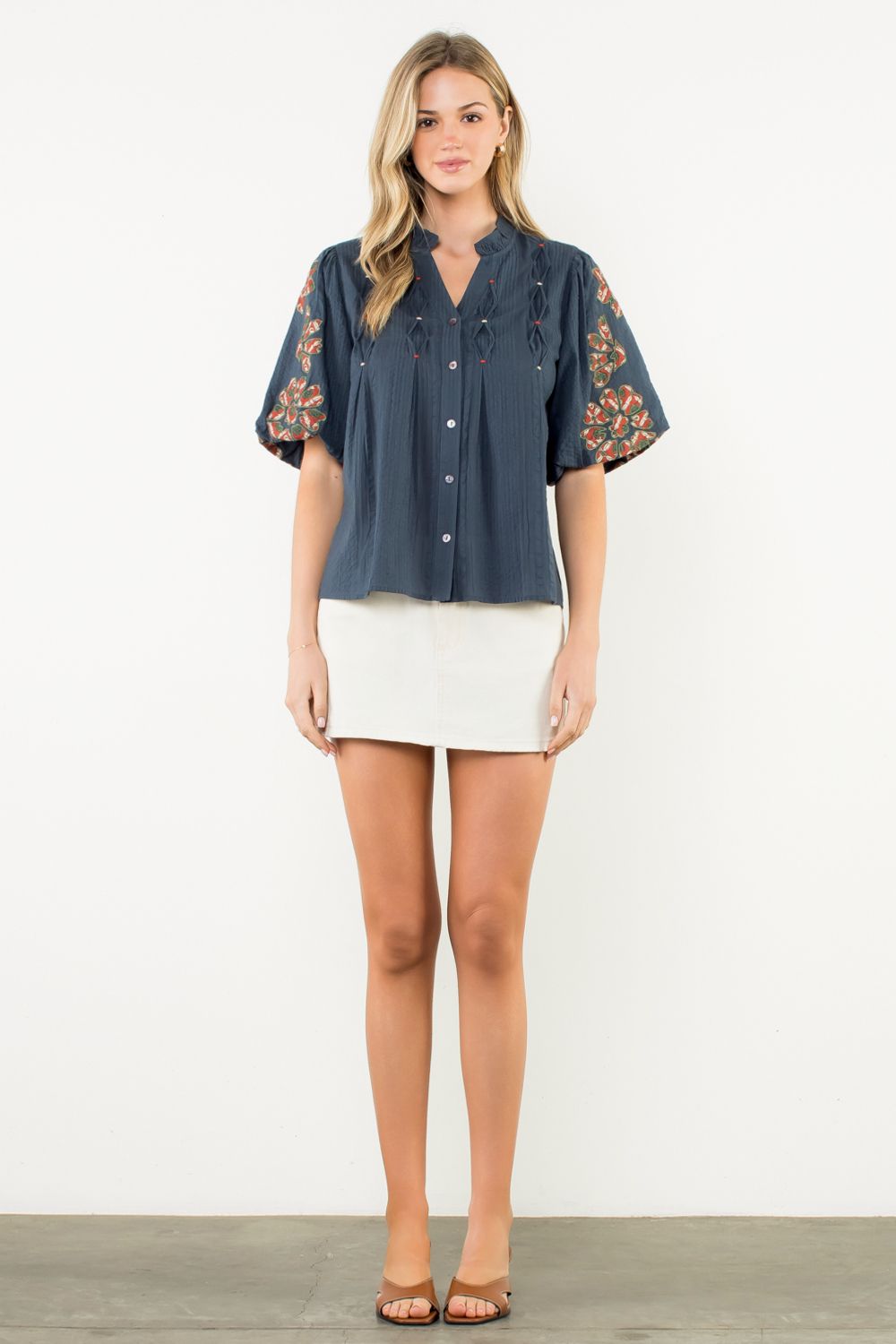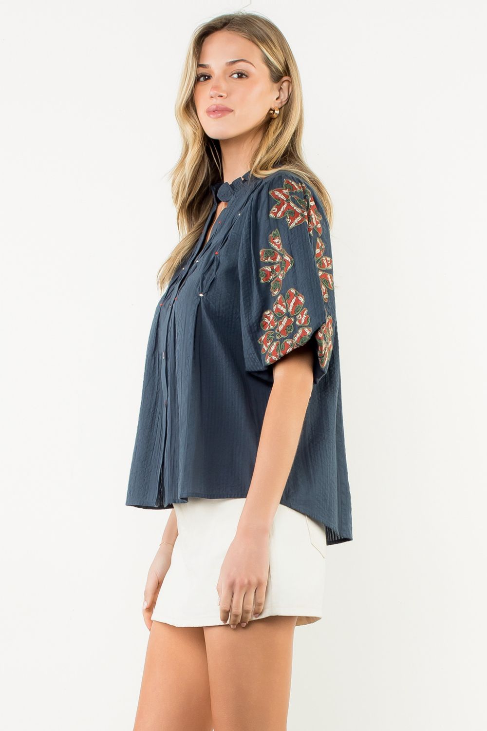 Kaia Embroidered Detailed Puff Sleeve V Neck THML Top