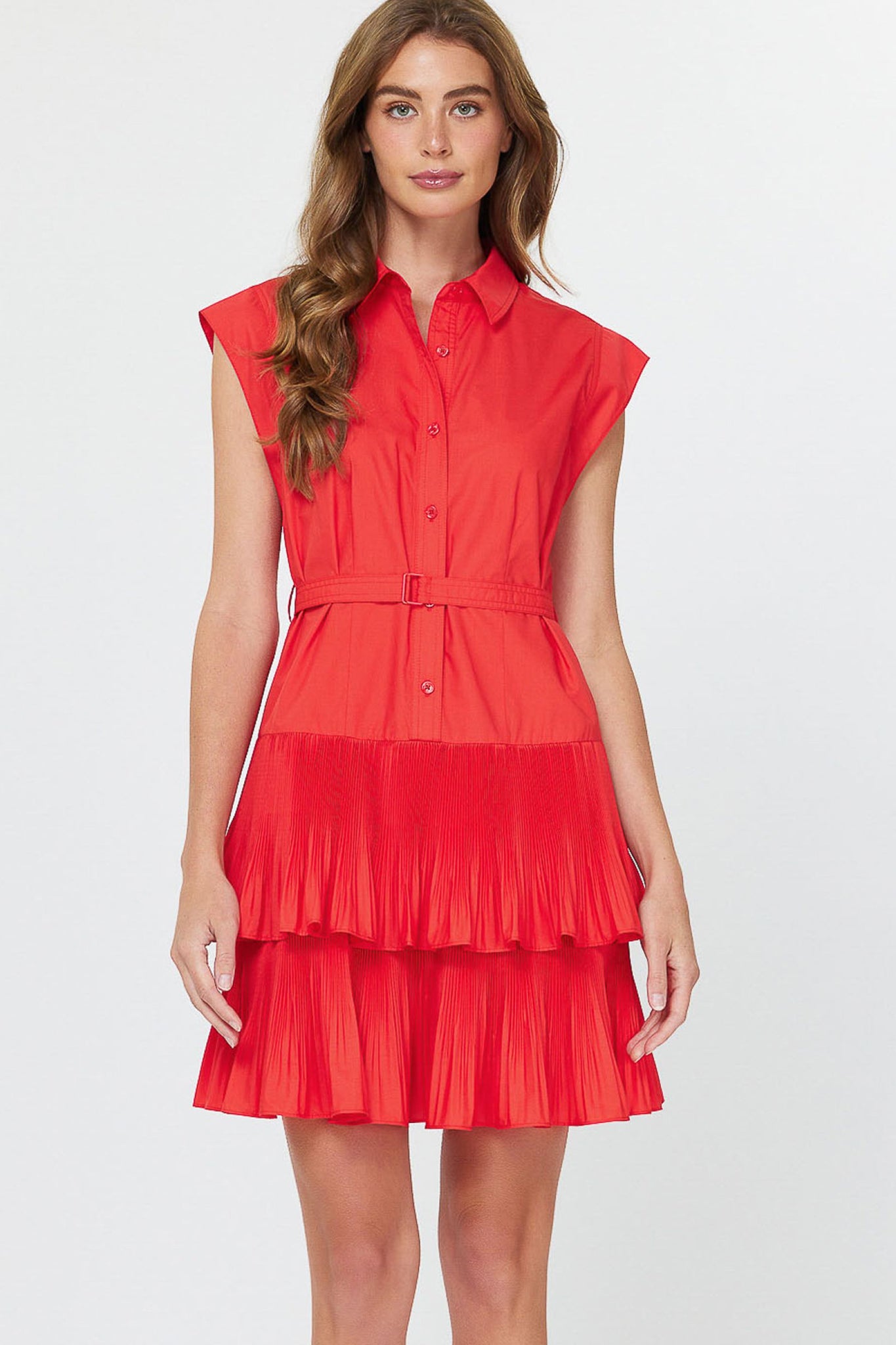A contemporary silhouette and cool details lend an updated perspective to this sleeveless mini dress. Featuring a crisp pointed collar and button placket up top, it's drawn in by a minimalist strap belt before flaring out to a dual-tiered skirt detailed with tiny pleats.