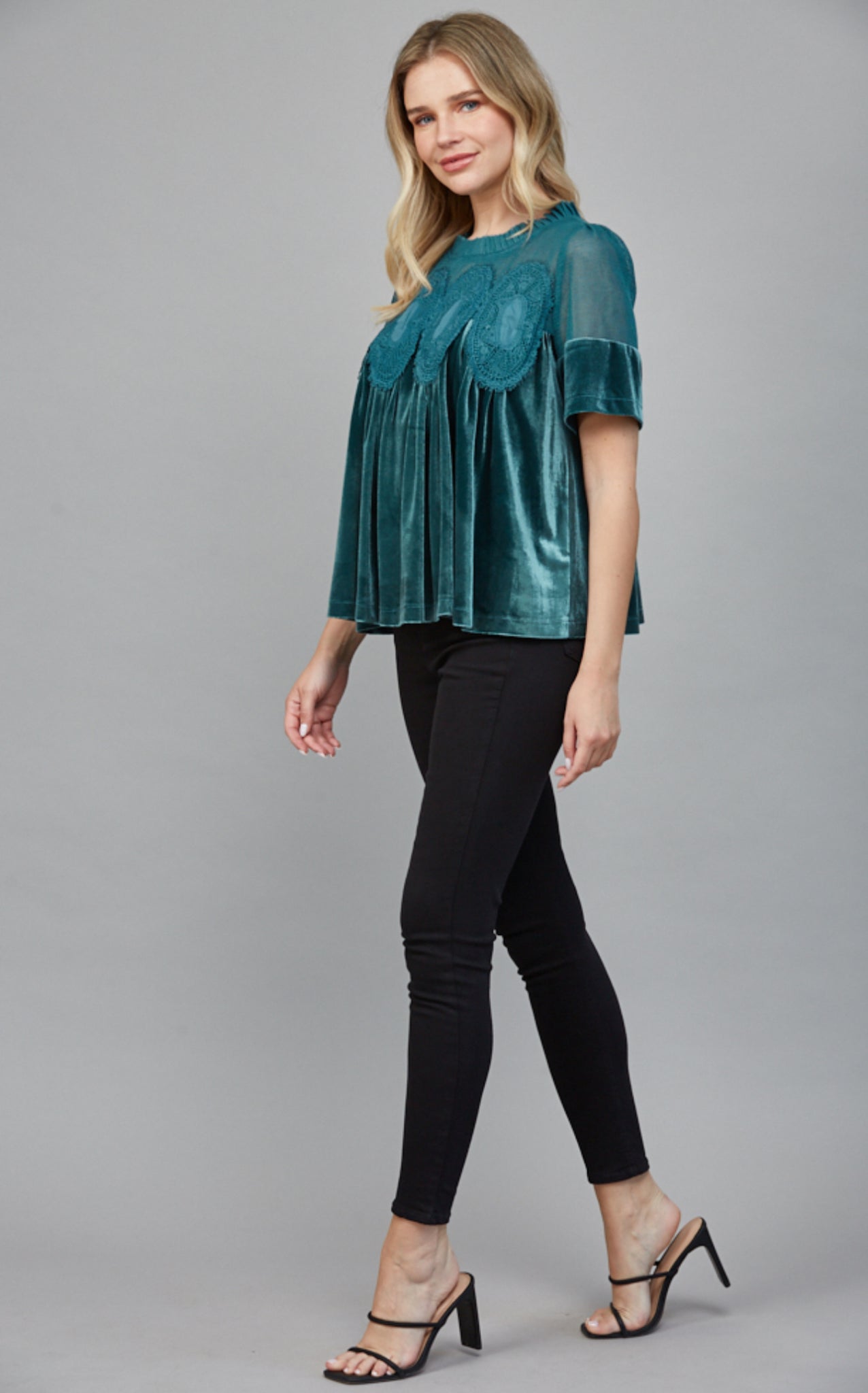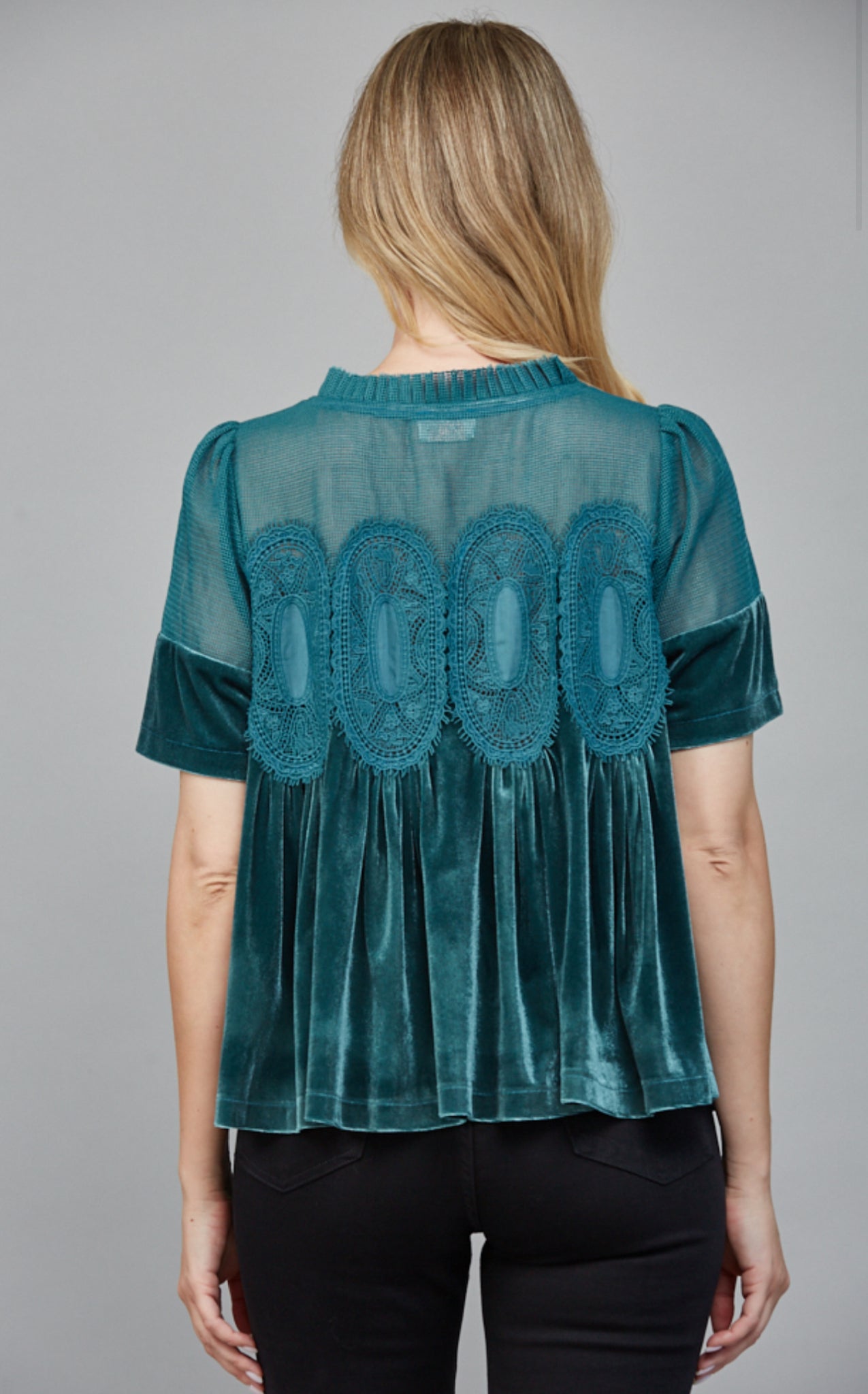 • LACE DETAIL VELVET BABYDOLL TOP
