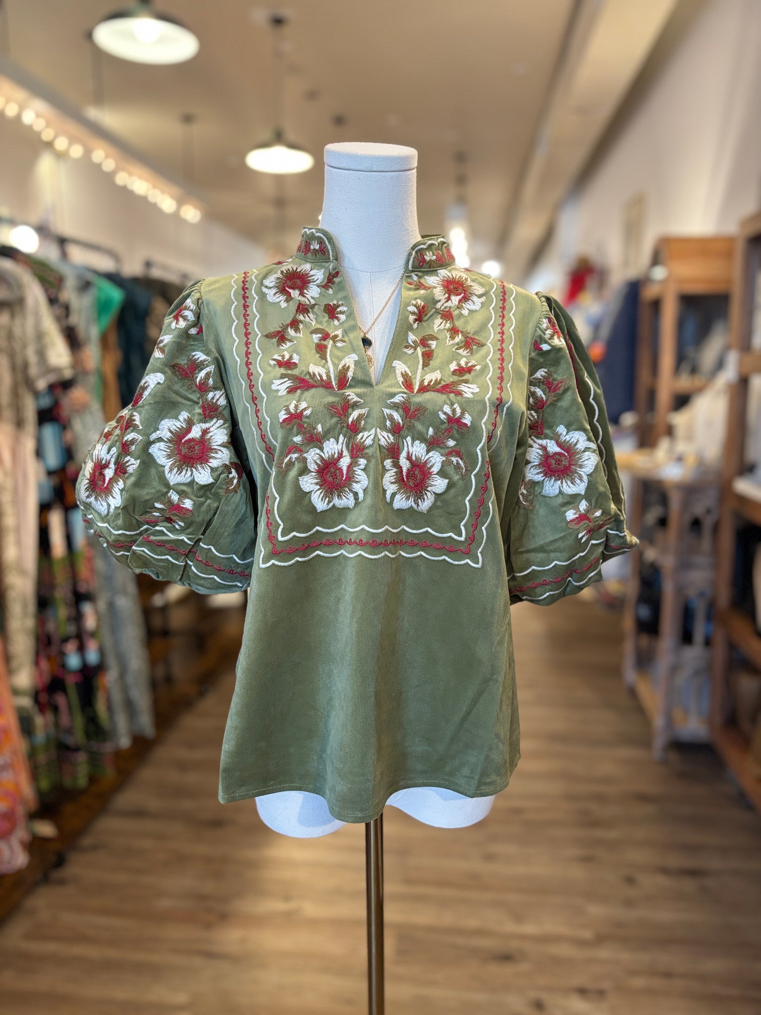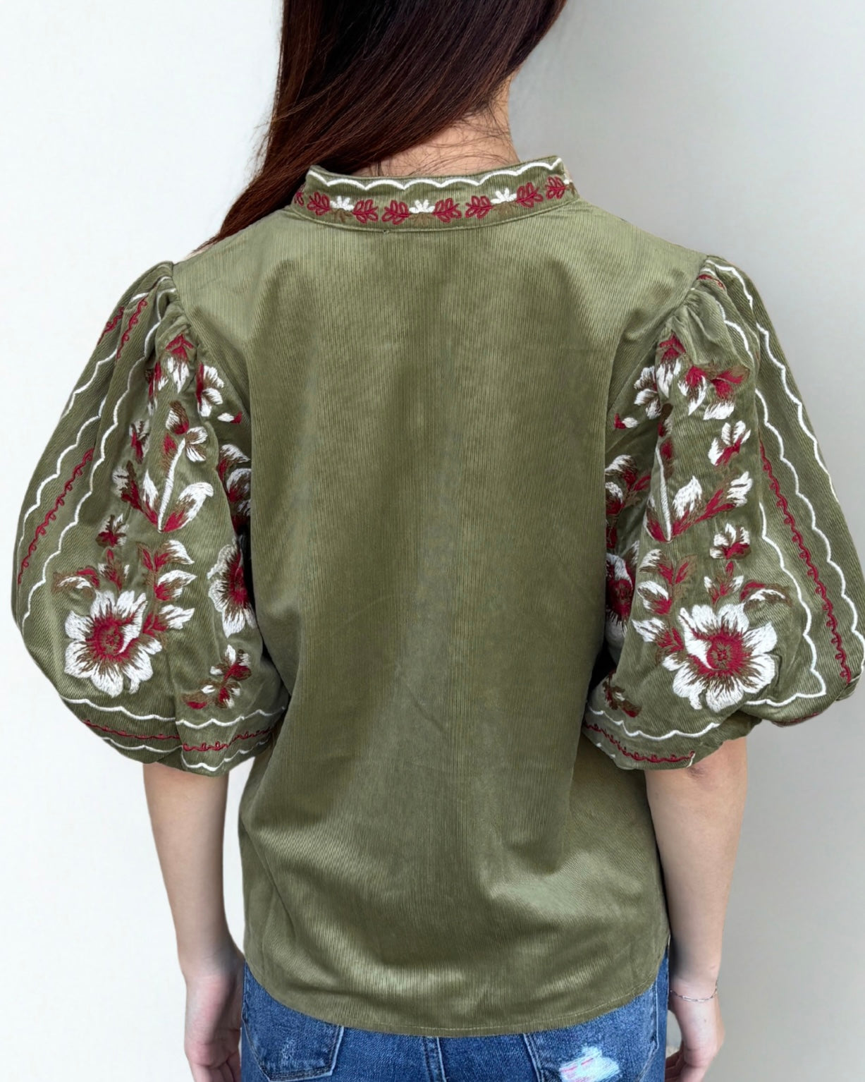 Laurel Puff Sleeve Floral Embroidery Corduroy THML Top