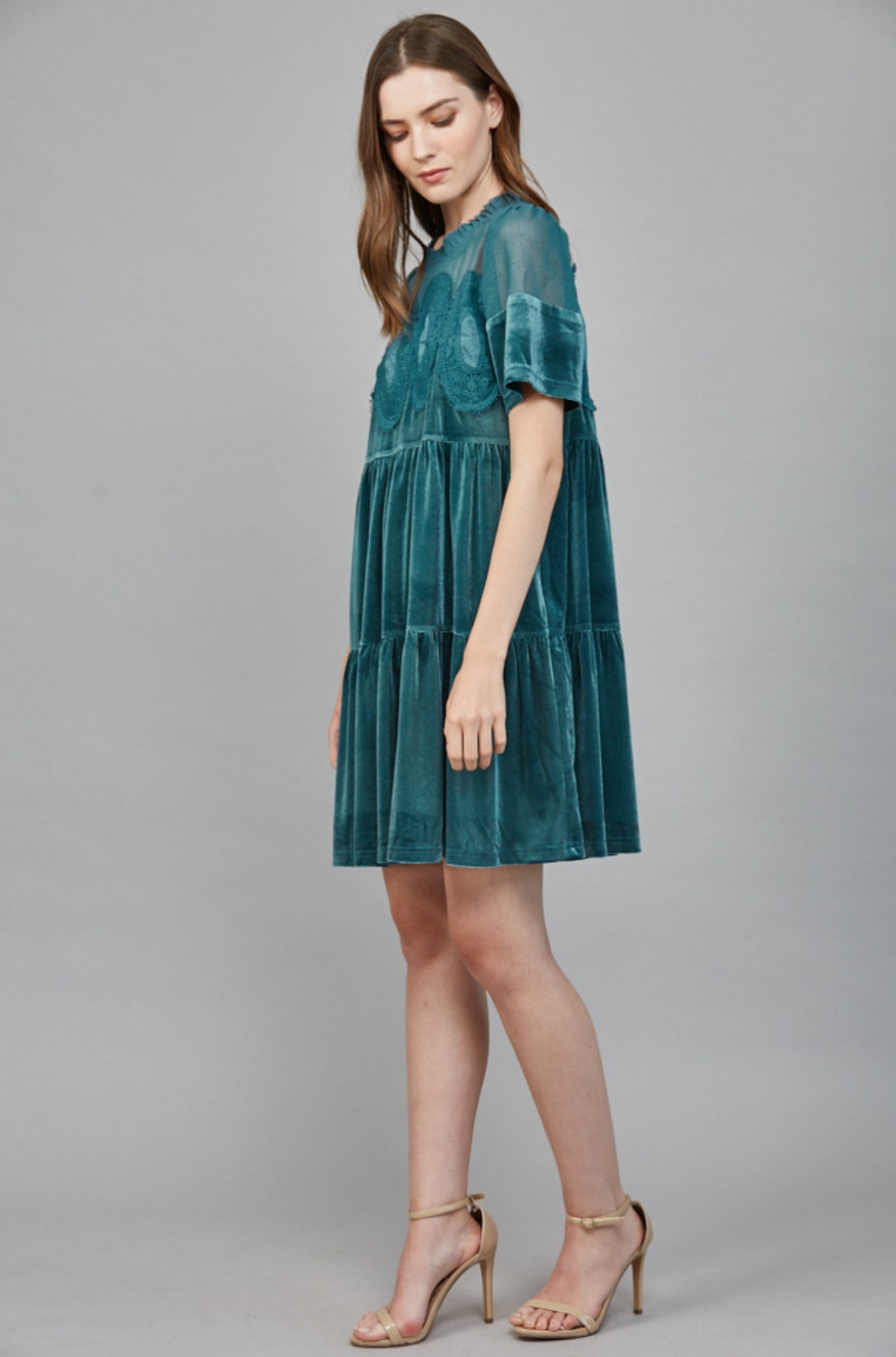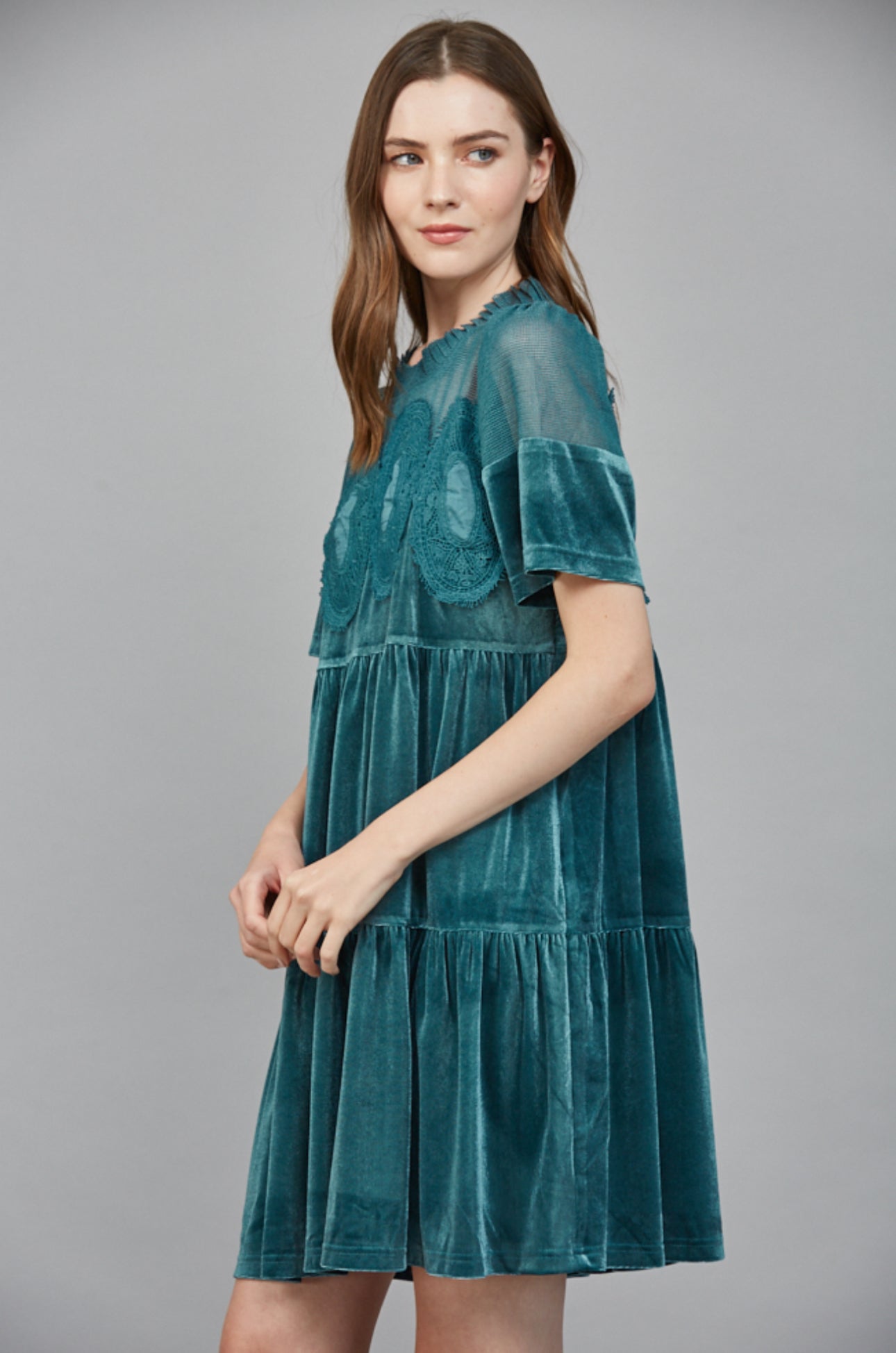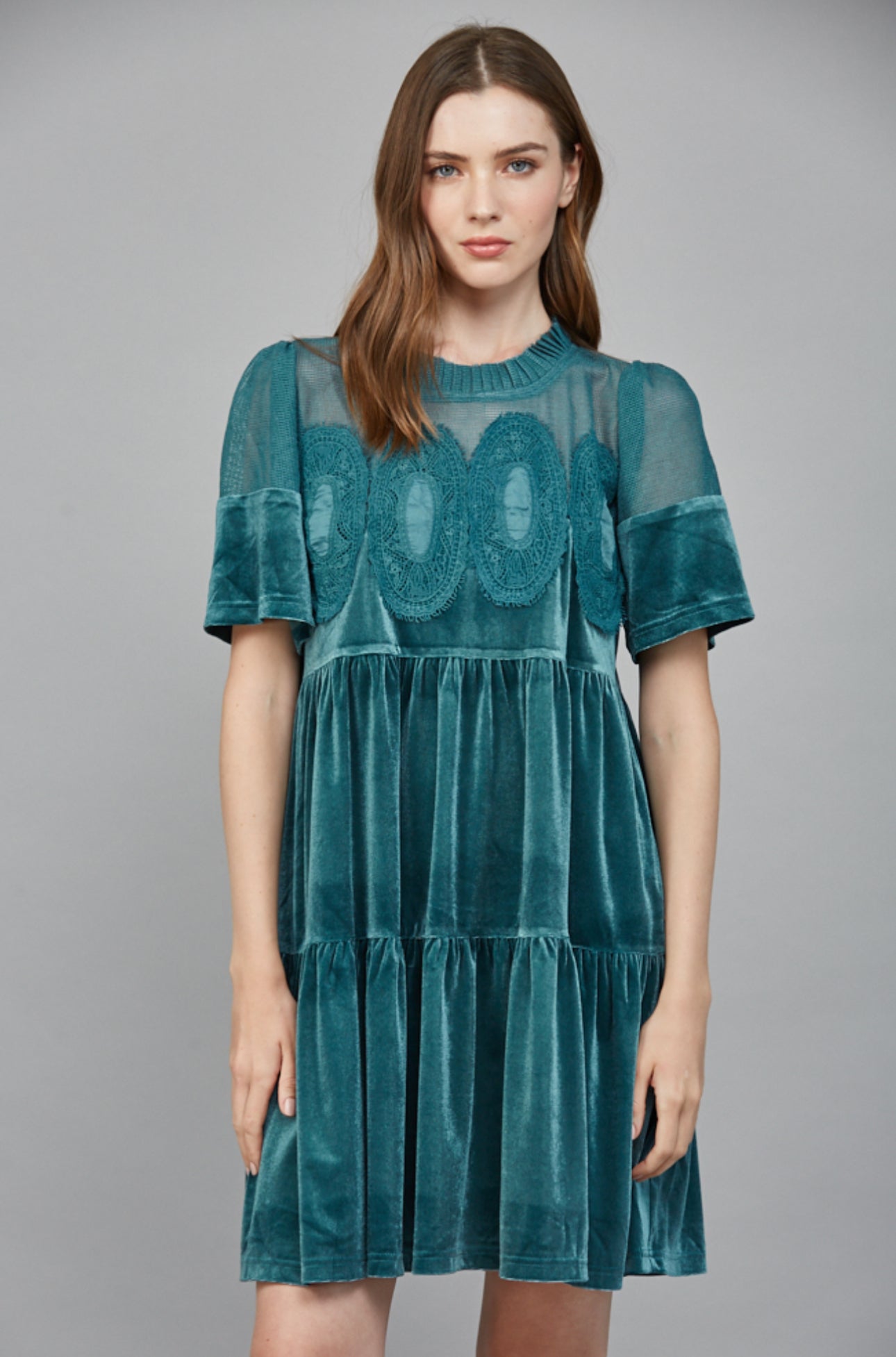 CONTRAST SHEER MESH PANEL WITH INTRICATE LACE DETAIL VELVET DRESS