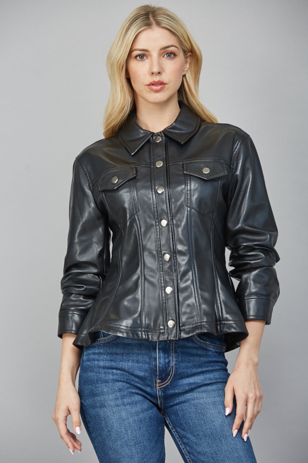 CINCHED 3/4 SLV DETAIL FAUX LEATHER PEPLUM JACKET