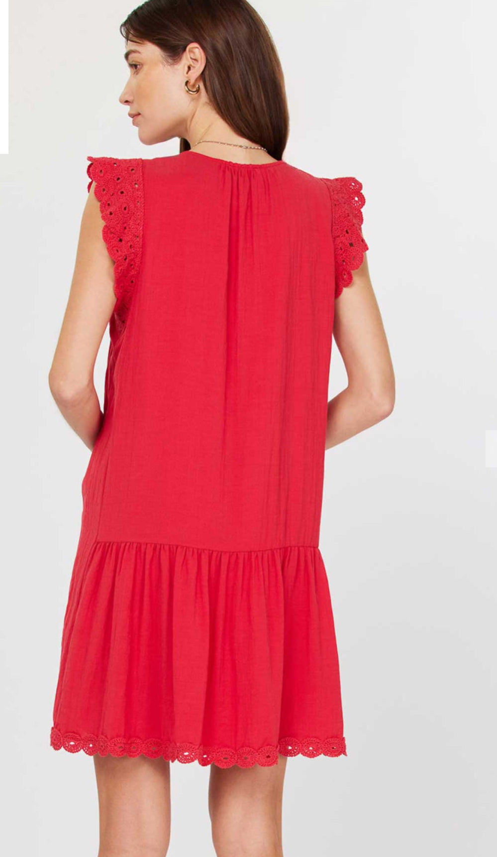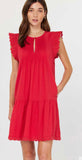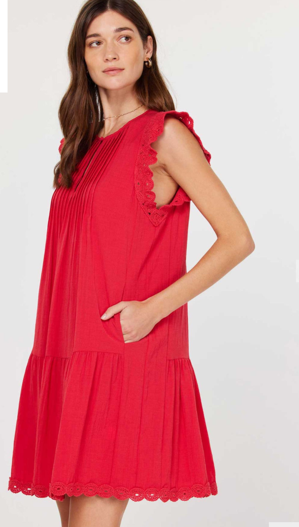 • ROUND NECK CROCHET SHORT SLEEVE TIERED MINI DRESS WITH FRONT BUTTON CLOSURE & PLEATED NECK & CROCHET DETAIL ON SKIRT