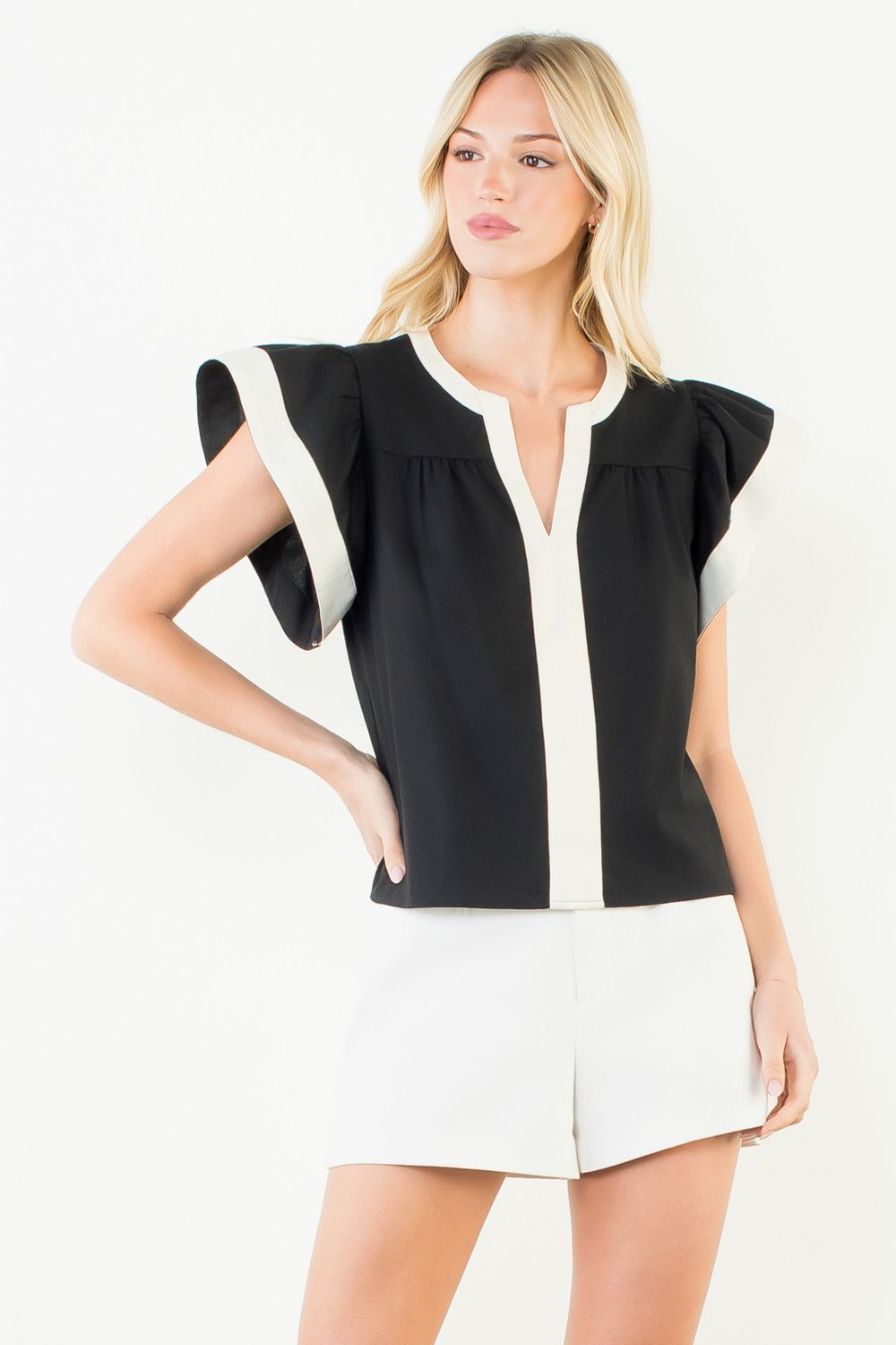 The THML Priscilla Flutter Sleeve V-Neck Top is a chic, elevated staple designed to take you from day to night with ease. Featuring a flattering V-neckline with contrast trim and soft flutter sleeves, this top offers a polished yet effortless silhouette. The breathable linen-blend fabric keeps it lightweight and comfortable, while the tailored fit adds a refined boutique feel. Perfect for workdays, dinners, or weekend outings, this versatile top pairs beautifully with denim, trousers, or skirts for an instantly put-together look.