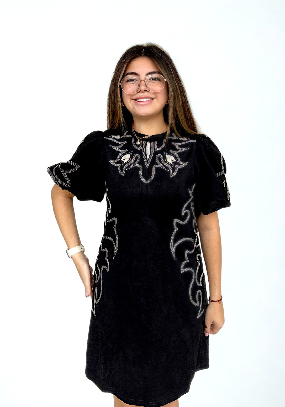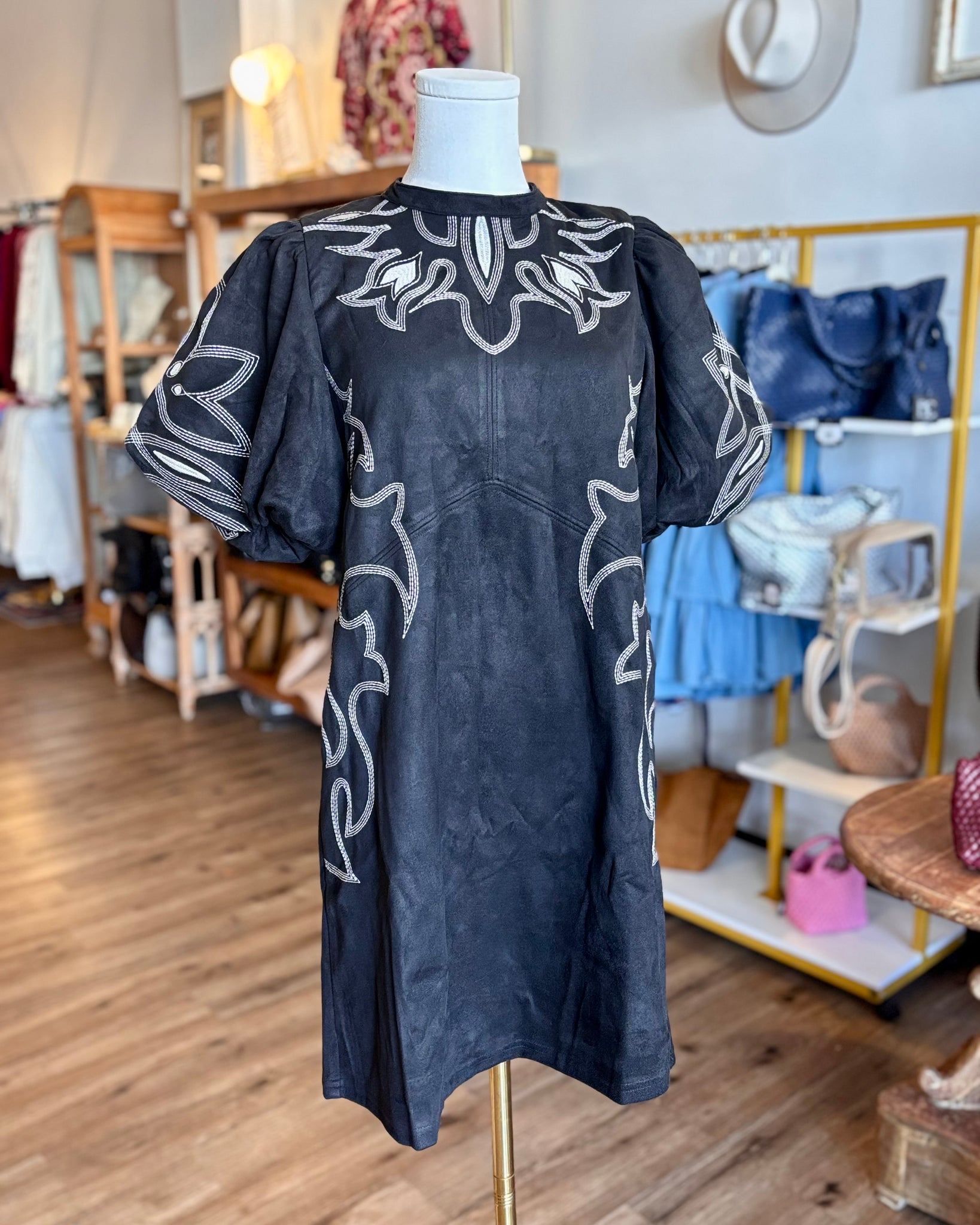 Beatrice Puff Sleeve Embroidery Detail Suede THML Dress