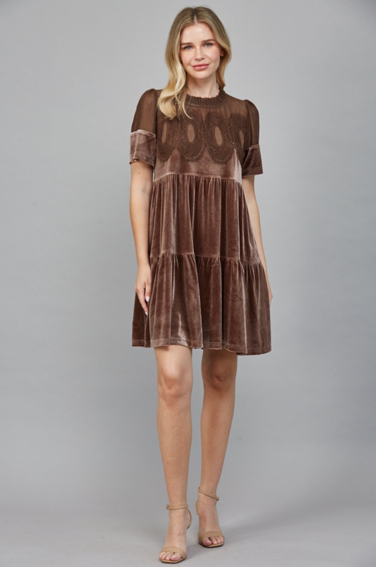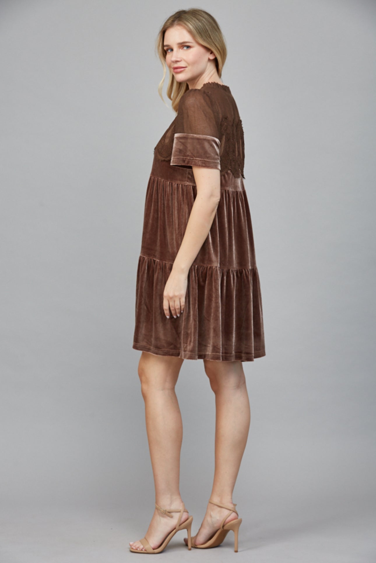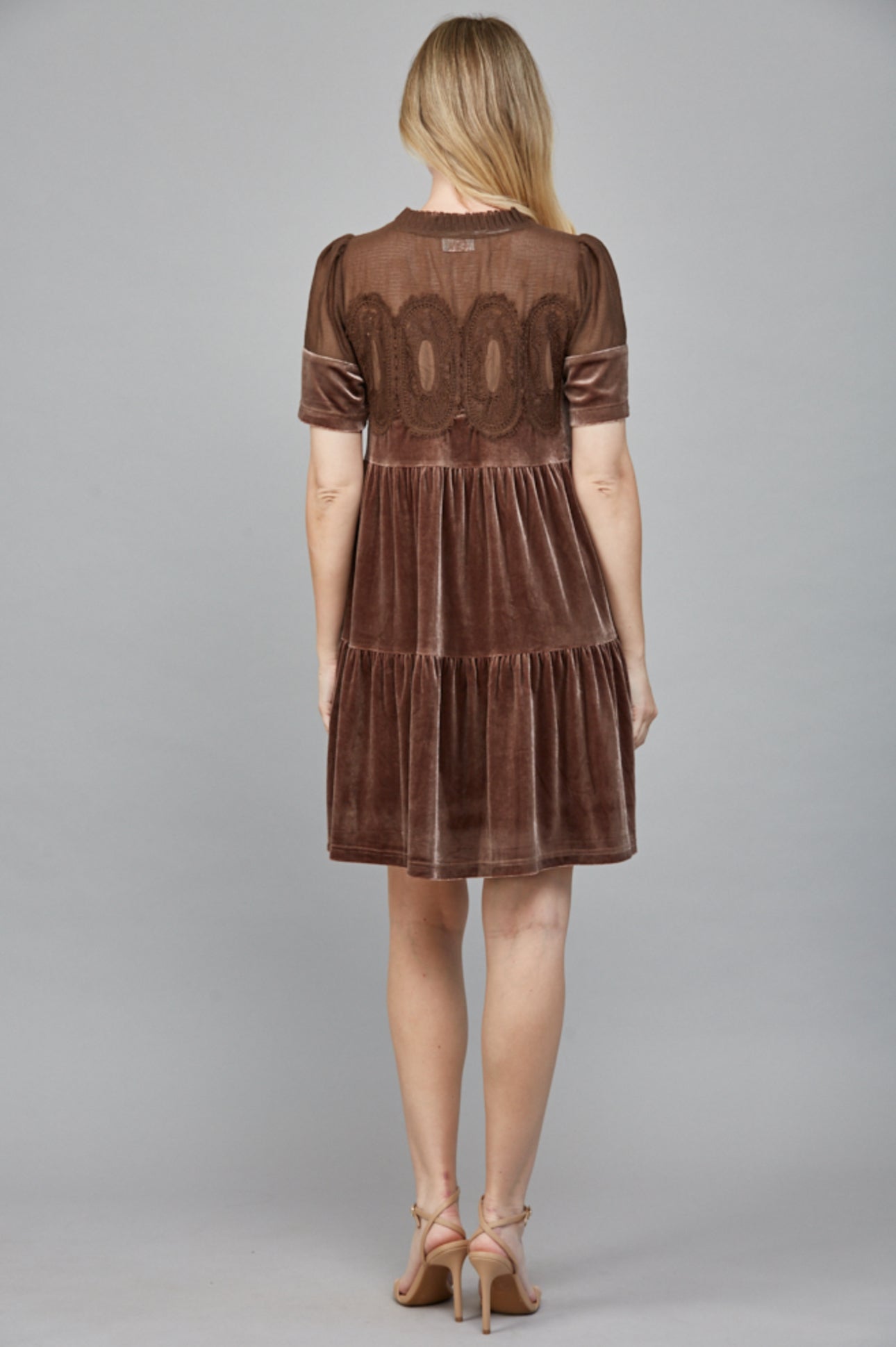 CONTRAST SHEER MESH PANEL WITH INTRICATE LACE DETAIL VELVET DRESS
