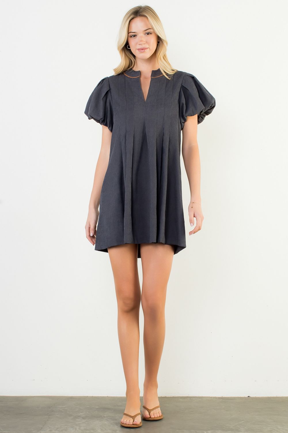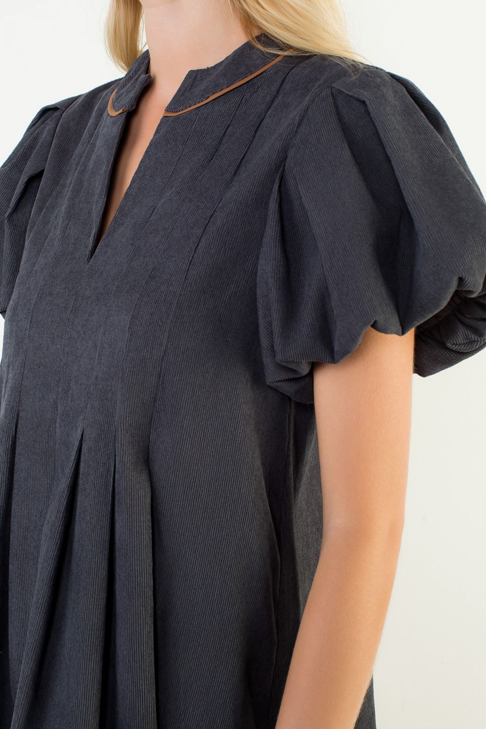 The THML Blair Puff Sleeve Corduroy Dress features soft corduroy fabric with statement puff sleeves for a feminine, vintage-inspired silhouette. Designed with a relaxed fit and flattering shape, this dress is perfect for fall and winter styling. Pair it with boots for an effortless everyday look or dress it up with heels and accessories for a polished outfit.