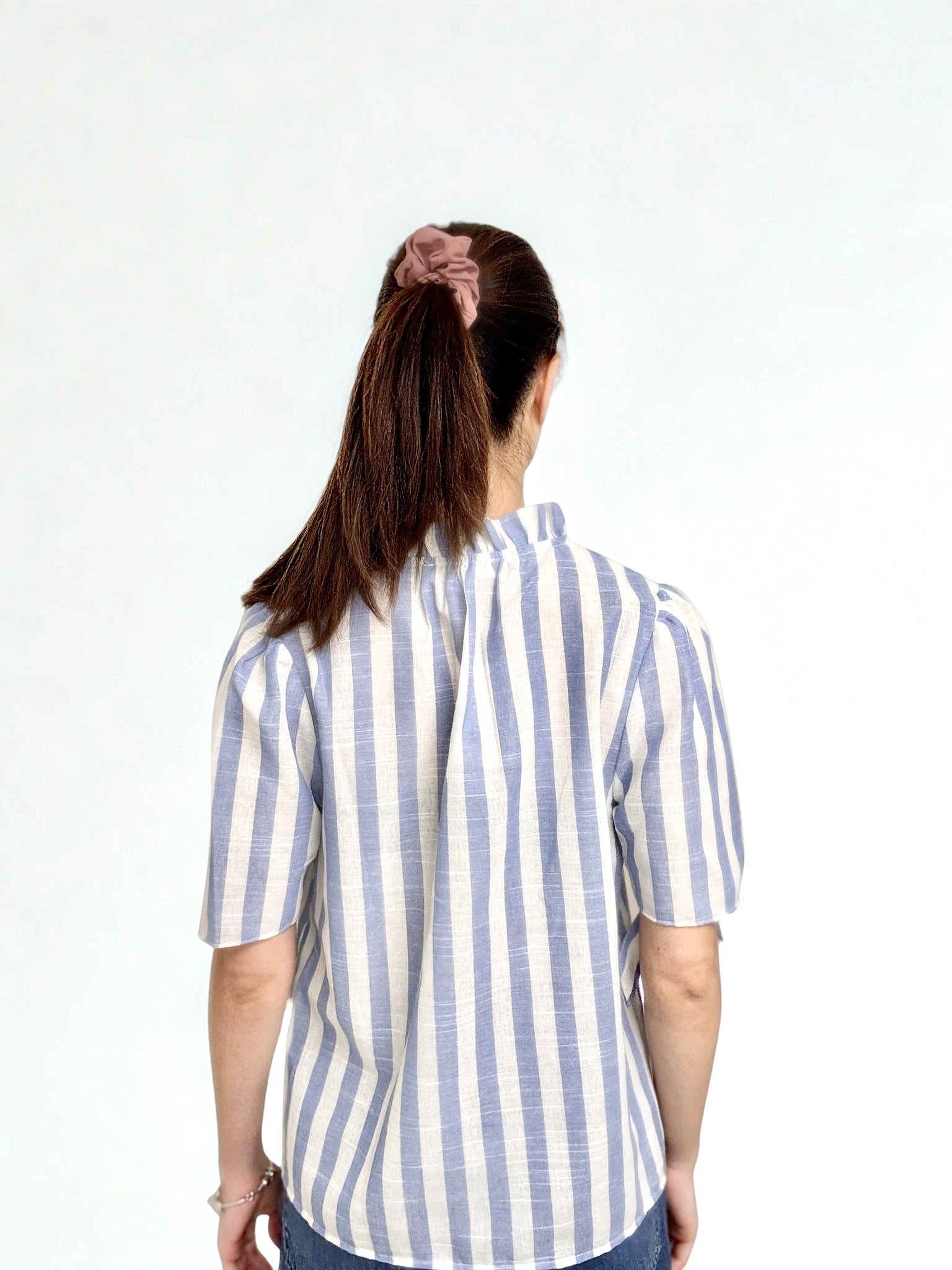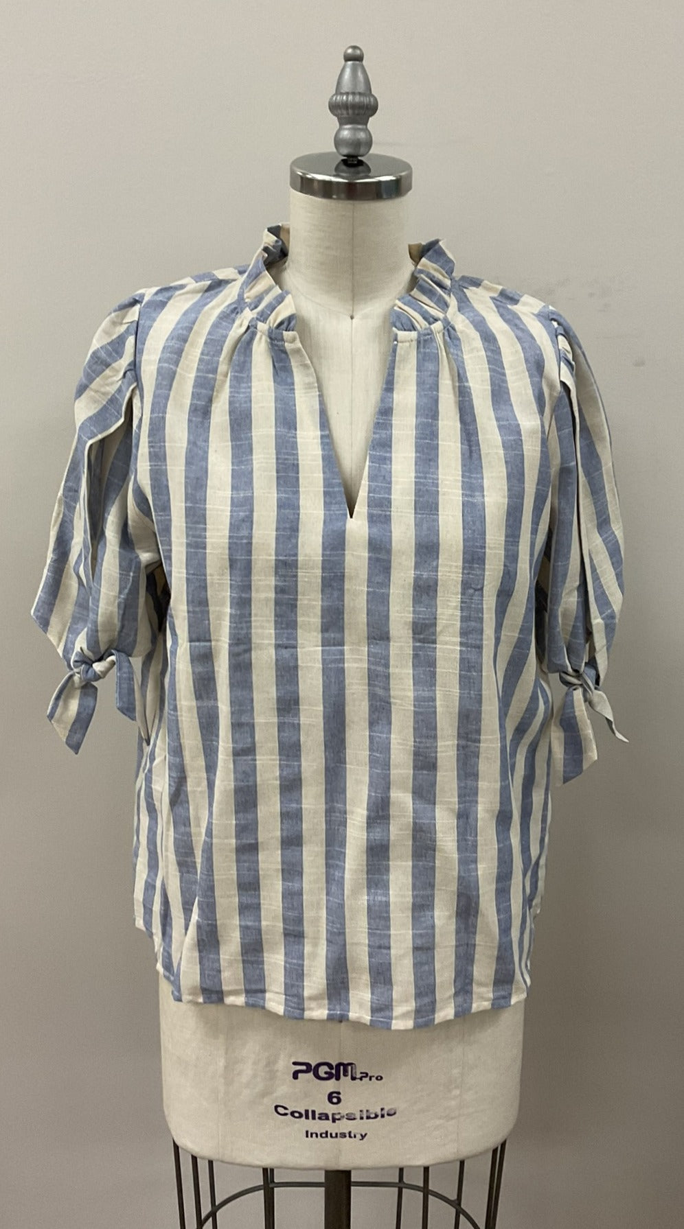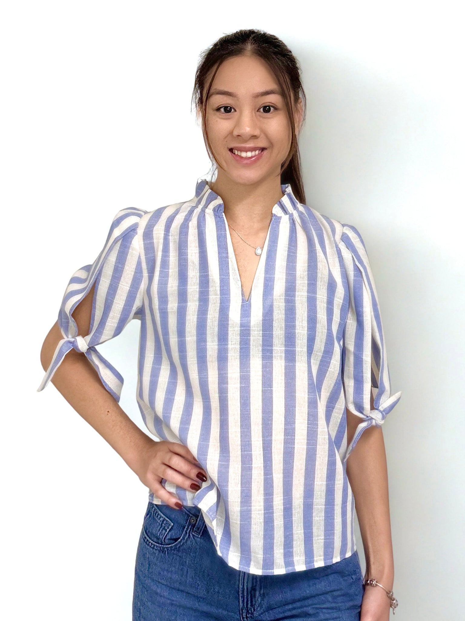 The THML Nory Stripe Top with Sleeve Tie is a timeless piece with an elevated, feminine twist. Featuring classic vertical stripes, a flattering split neckline, and softly structured sleeves finished with delicate tie details, this top blends everyday ease with polished style. The breathable cotton fabric keeps it lightweight and comfortable, making it perfect for workdays, casual outings, or weekend brunch. Pair it with denim, shorts, or tailored pants for an effortlessly chic look.