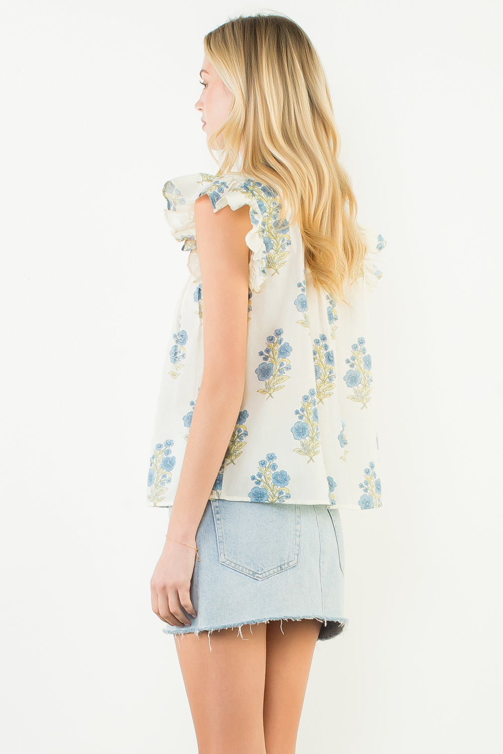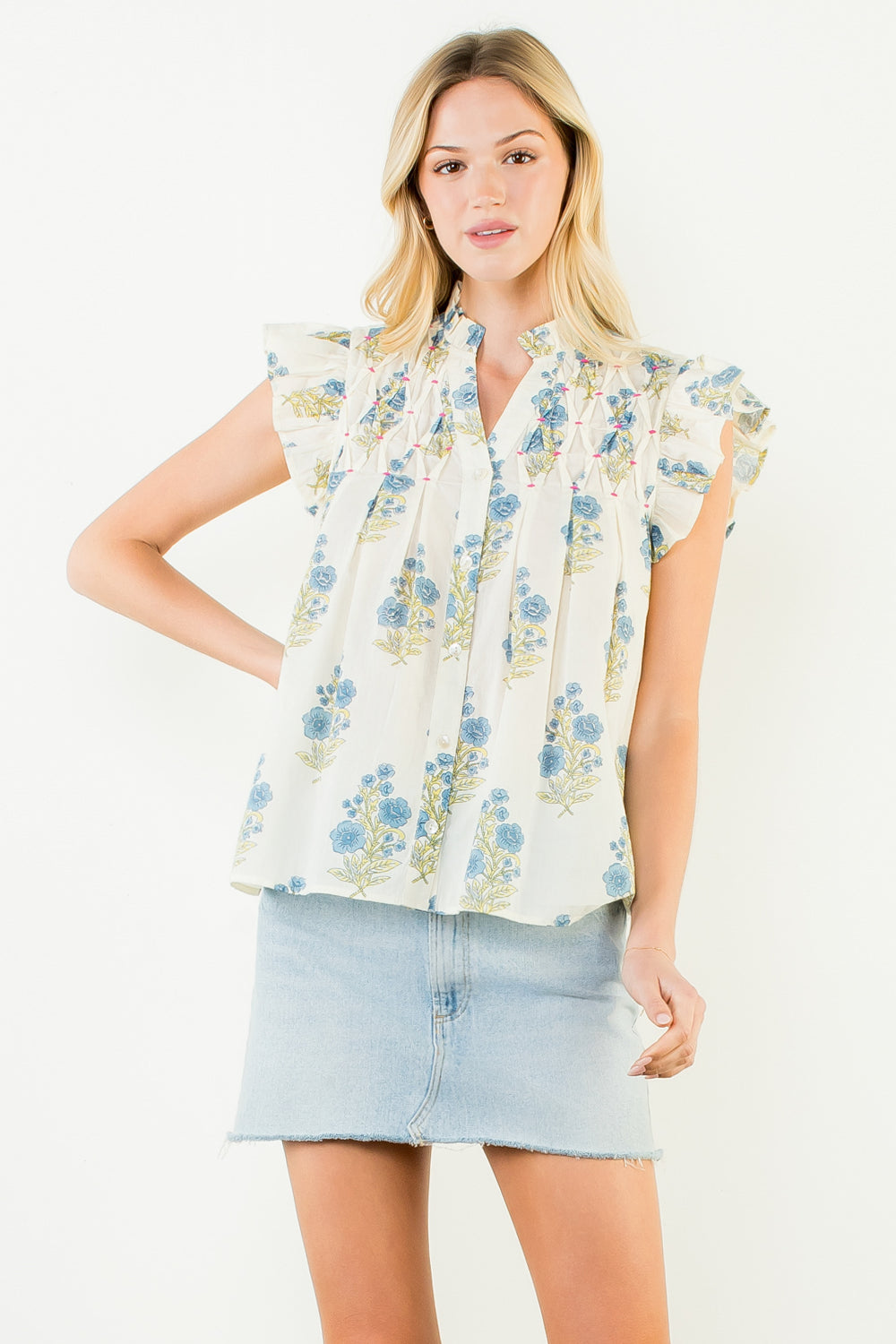The THML Marcia Flutter Sleeve Floral Pattern Top is a feminine, statement-making piece designed with effortless charm. Featuring dramatic ruffle sleeves, a flattering V-neckline, and a lightweight woven cotton fabric, this top offers a breezy, relaxed fit with elevated detail. The soft floral pattern adds a romantic touch, making it perfect for spring and summer styling. Pair it with denim shorts, white jeans, or a skirt for brunch, vacations, or everyday wear when you want an easy yet polished look.