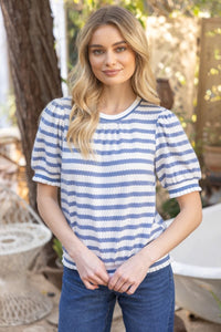 STRIPED CONTRAST BAND SHORT SLEEVE KNIT TOP