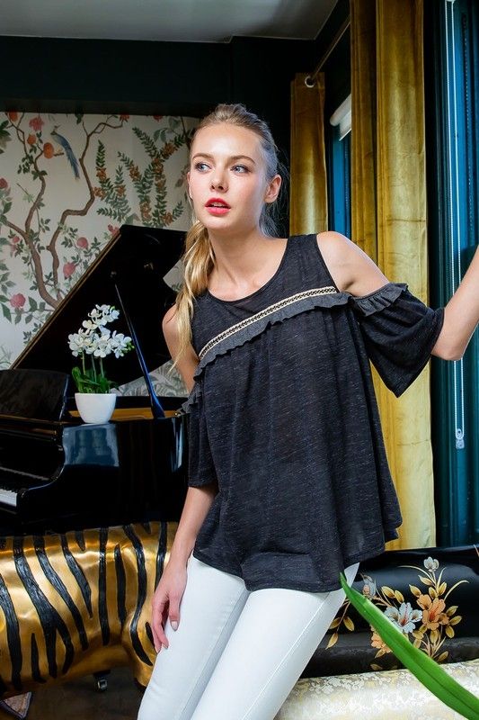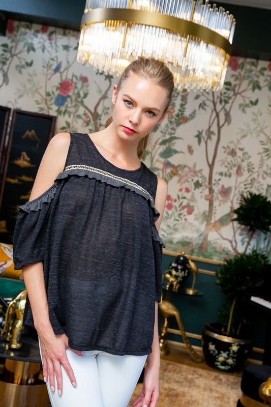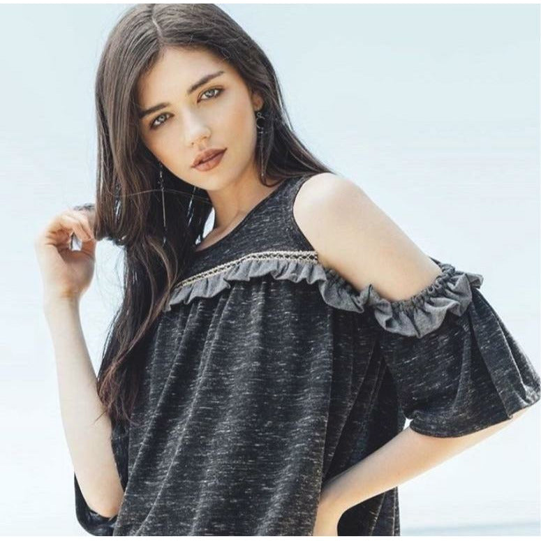 Layla THML Dark Grey Cold Shoulder Embroidered Top-SALE