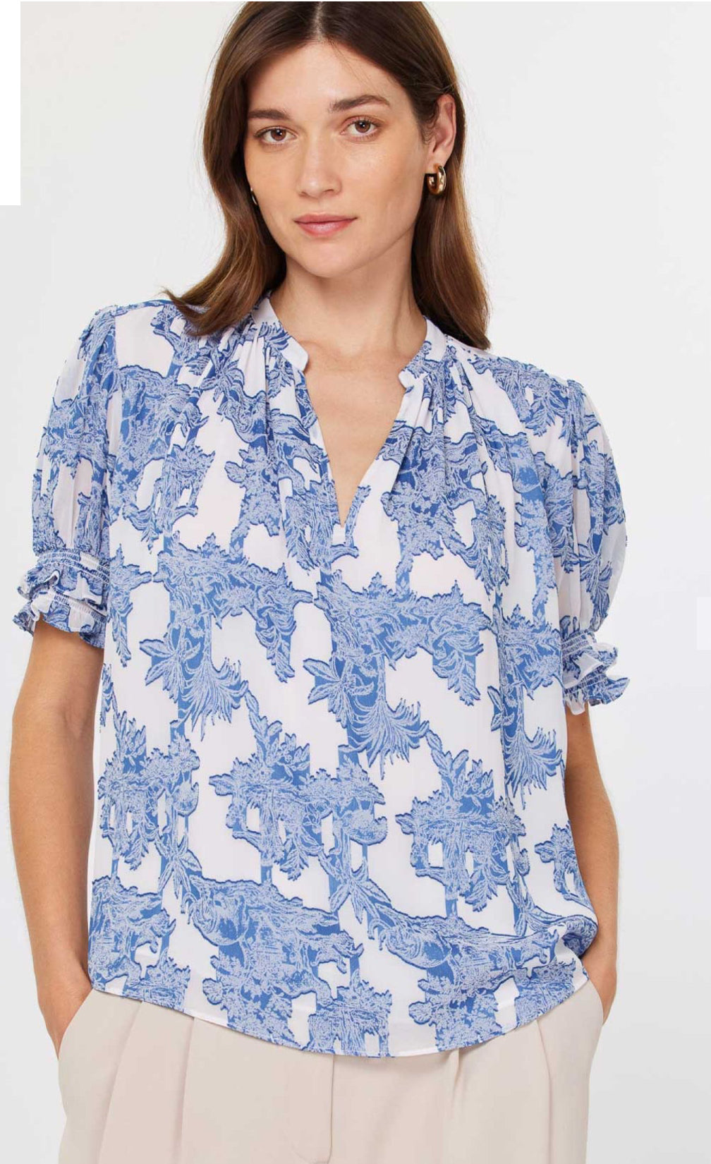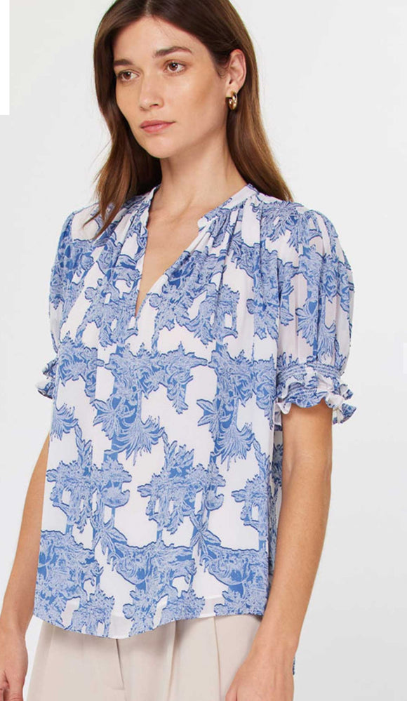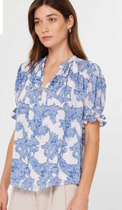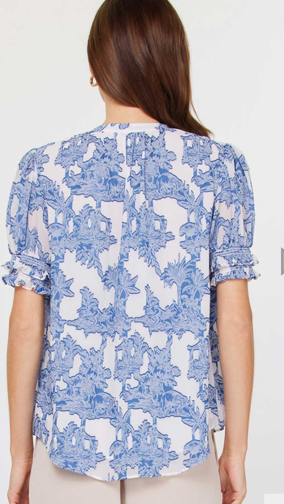 • V-NECK SHORT SLEEVE MANDARIN COLLAR BLOUSE WITH SMOCKED TIERED RUFFLED SLEEVE DETAIL